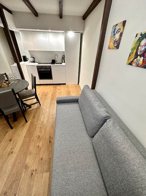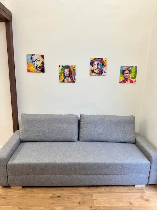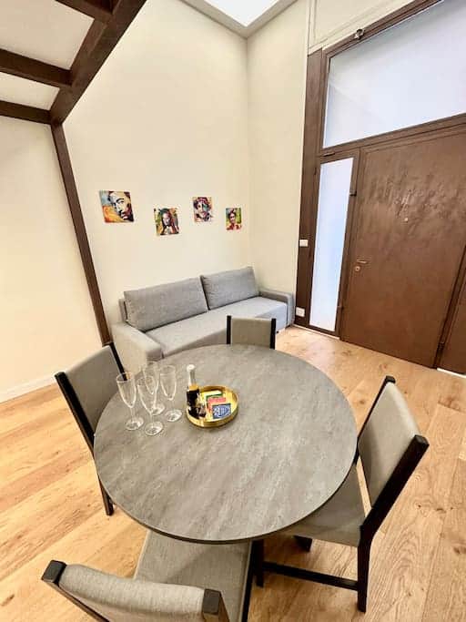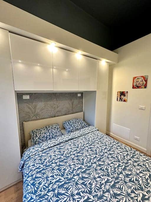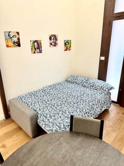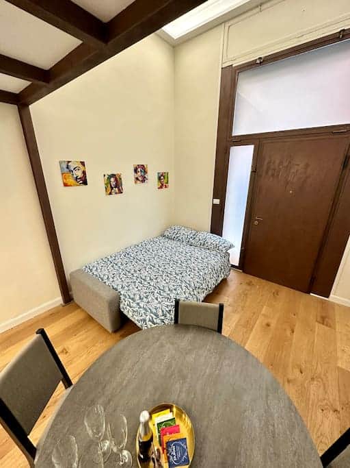 Per dormire ci sono un letto matrimoniale in camera, un letto matrimoniale nel soppalcoe un divano letto nel soggiorno (140×200).